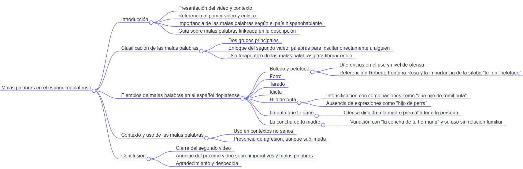I used an external transcription service for my second video in the #MalasPalabras series on YouTube, and it also generated a mind map that makes me kind of proud because I didn’t deliberately set ou to do it so schematic.